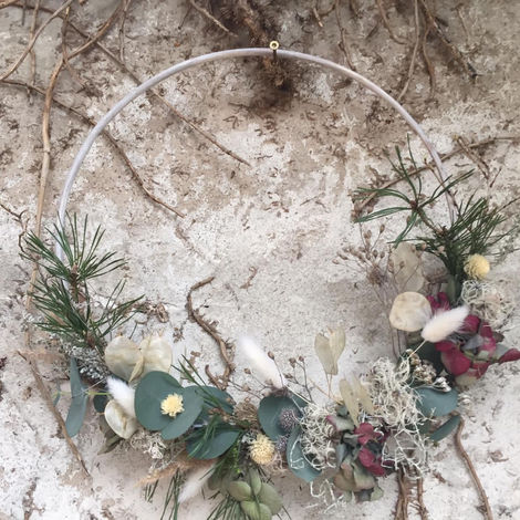 Flowerhoops sind Blumenarrangements, die auf einem Ring (Hoop) aus Holz oder Metall gebunden werden. Dabei sollte ein Teil des Rings sichtbar bleiben. Der Hoop wird aus Trockenblumen, Naturblumen die gut trocknen, Gräsern und geeigneten Grünpflanzen wie Eukalyptus gebunden.